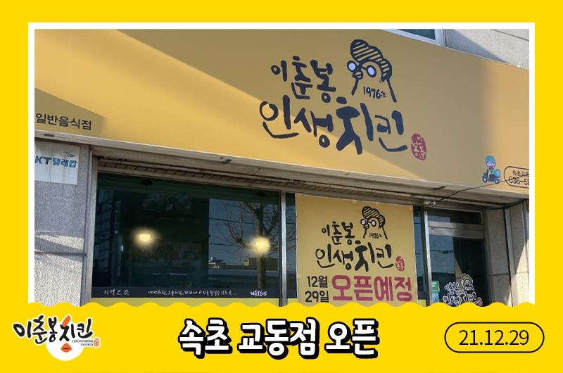 · 이춘봉 치킨 속초 교동점 오픈 2021. 12. 29매장 주소 : 강원 속초시 수복로 85 매장 전..