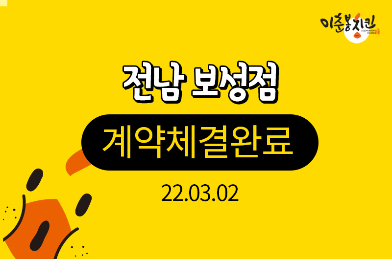 이춘봉 치킨전남 보성점 계약체결완료 [계약일] 2022. 03. 02 [매장(예정)주소]전남 보성..